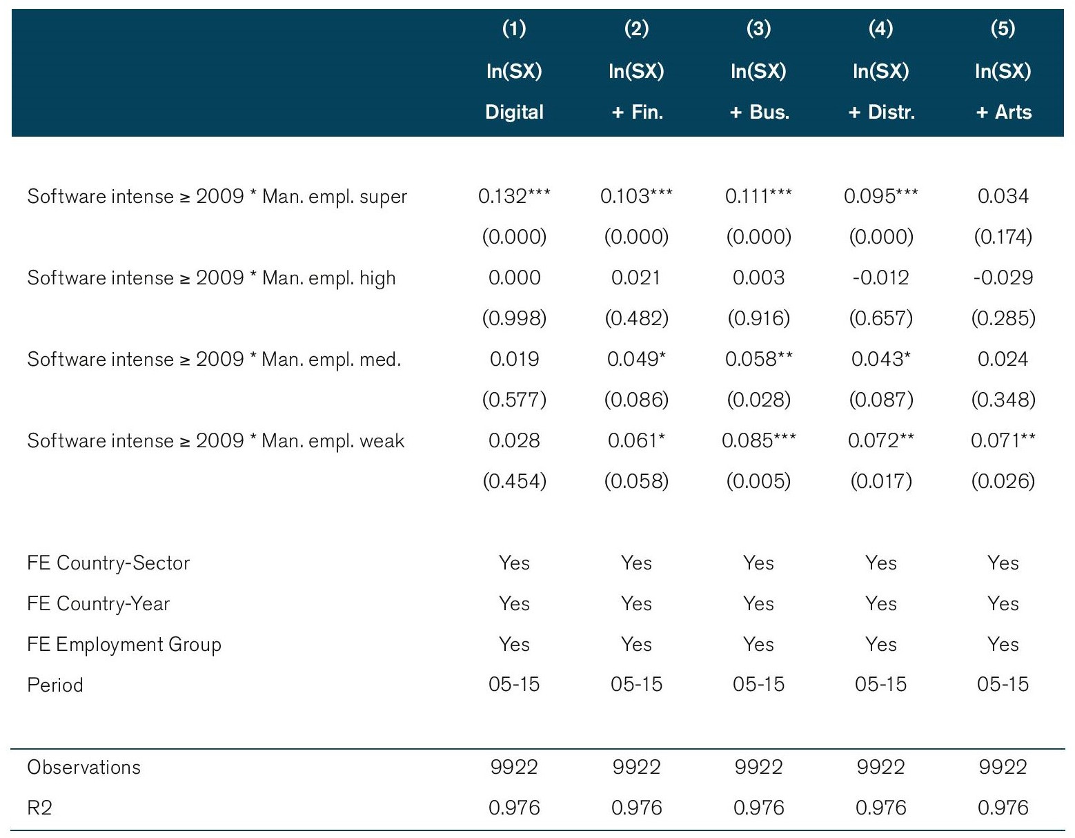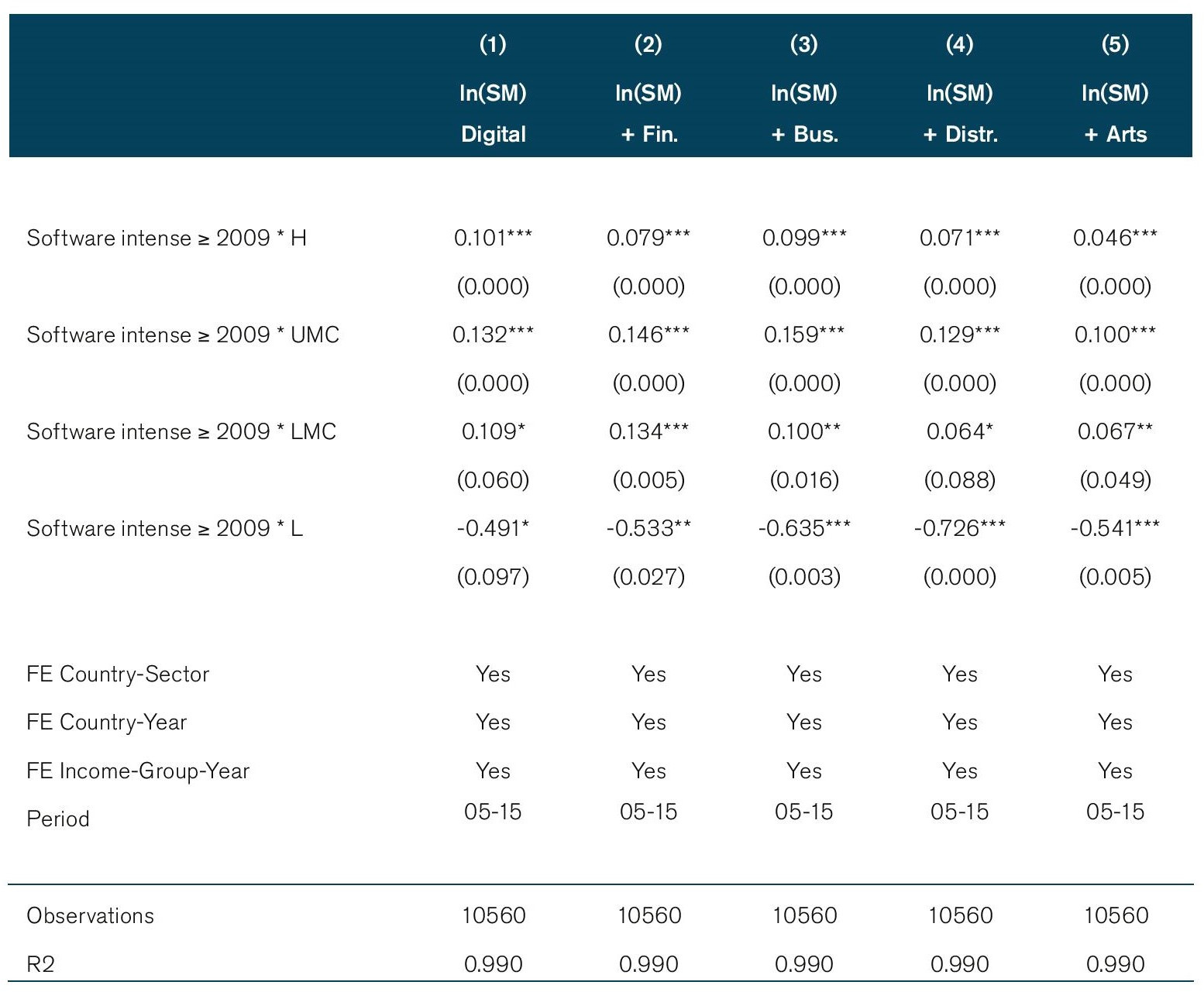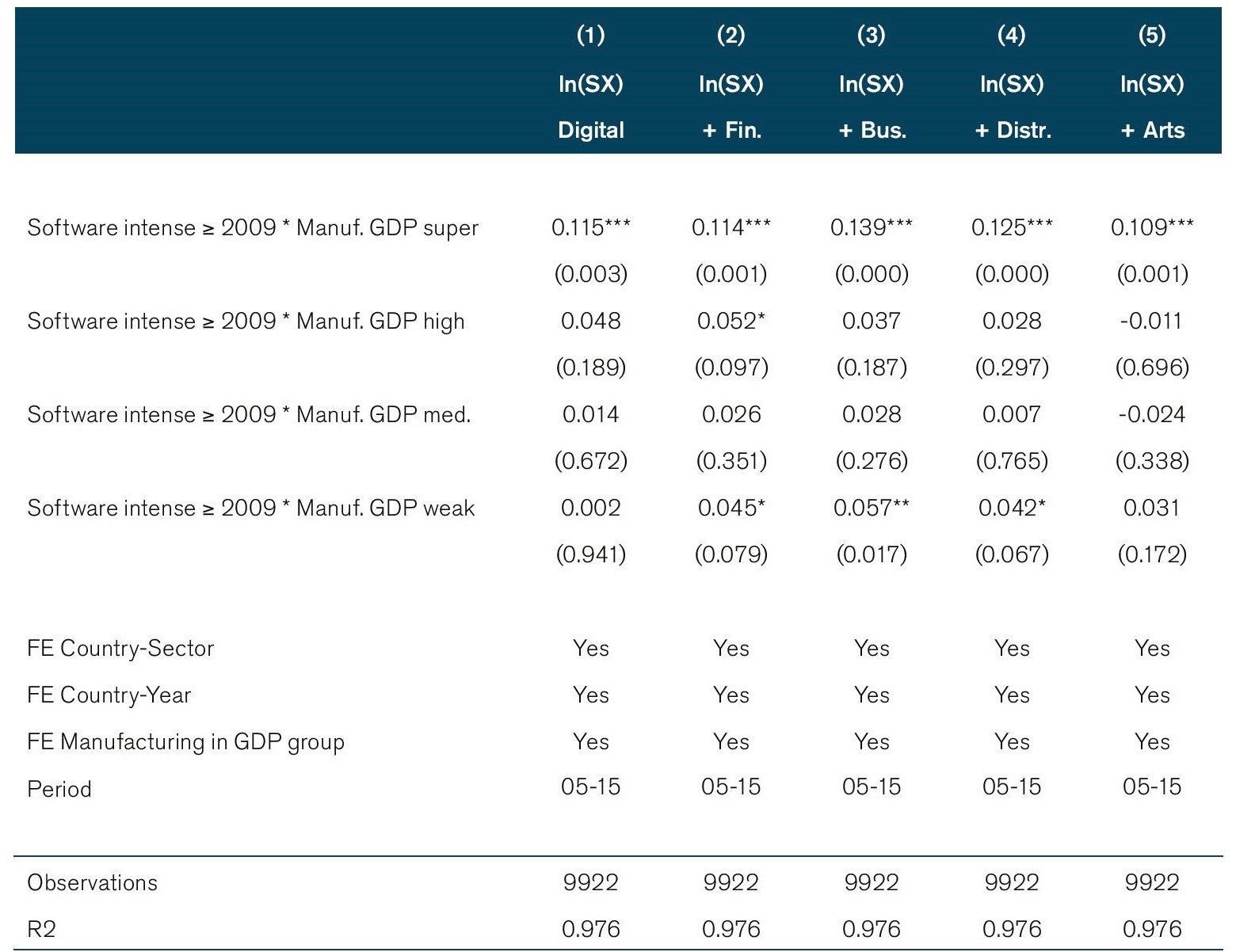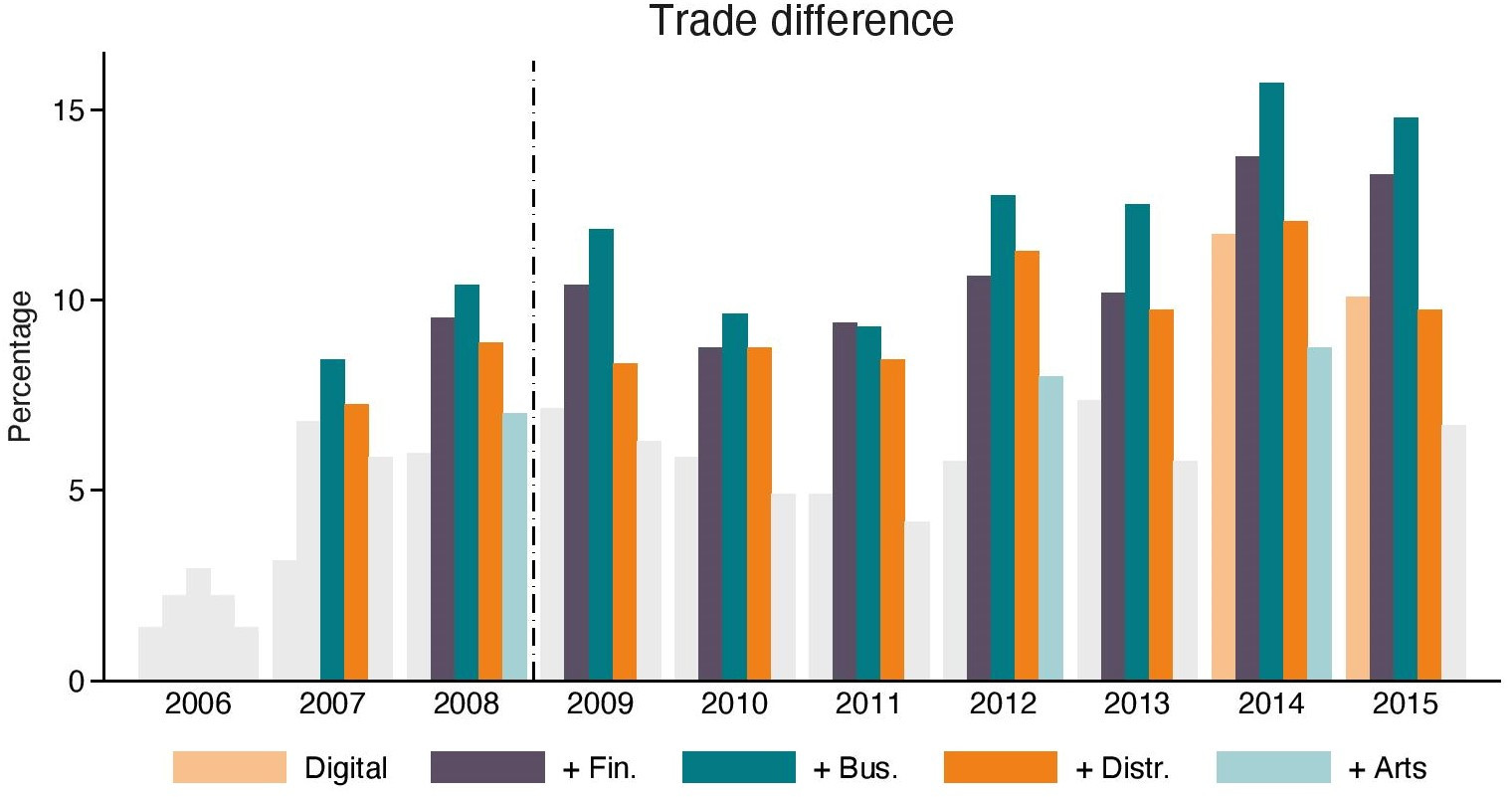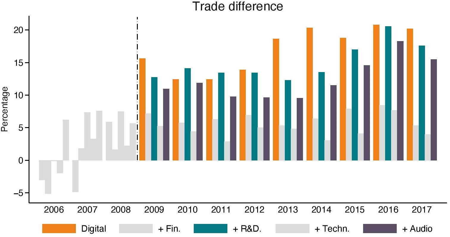 In economic terms, by taking these two coefficient results and computing the expected values implies a trade impact that ranges between 6.1 and 6.6 percent. It suggests that digital services sectors have experienced a higher increase of exports of about 6 percent compared to non-digital sectors in the years following the GFC, i.e. after 2008