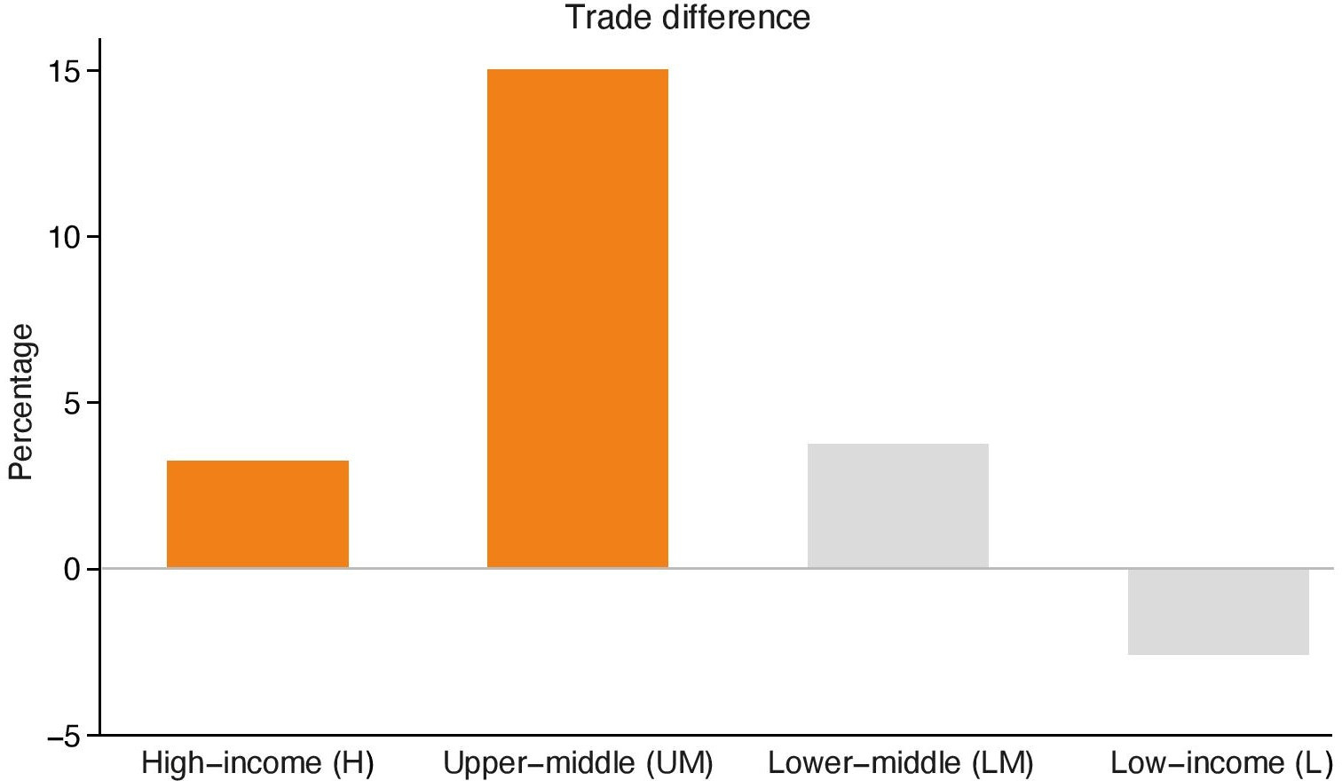 In this table, the group of upper-middle income countries obtain a positive and highly significant coefficient result throughout all digital sector specifications. The list of countries falling in the middle-income group are for instance Argentina, Costa Rica and Malaysia. In column 3 covering the preferred list of digital sectors the coefficient result for the high-income group is only weakly significant. High-income groups include countries such as Hong-Kong, the UK, the USA and Japan. In all other country groups, no statistical significance is found. Note that the trade difference is economically more important for the middle-income group than for the high-income group. Figure 6 sets out these computed trade differences in digital service trade for each income group, with the coloured bars indicating when this trade impact is significant. Upper middle-income countries have experienced an increase in digital services trade that was 15 percent higher than non-digital sectors following the GFC, a more than threefold increase compared to high-income countries where this growth was only 3.25 percent.