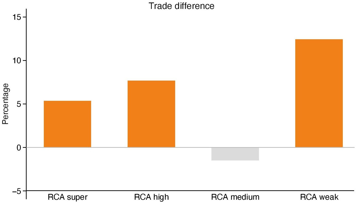 Figure 7: Trade impact from extended baseline regression by RCA group