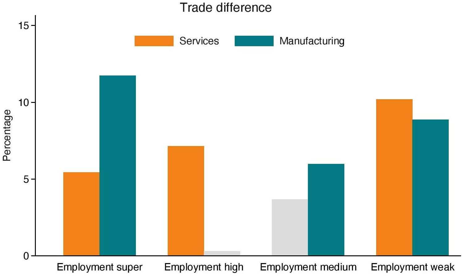The analysis further reveals that countries with high internet usage as a share of the population and countries with already high comparative advantage in services have also seen a significant break in digital services trade form other non-digital services. Overall, these outcomes don’t come as a surprise as internet usage and export productivity are strong predictors for digital services trade. What is more surprising however is that countries with a very high share manufacturing value-added and employment have seen the greatest digital services trade growth. Countries where value-added and employment in services are high have profited from this digital shift too, but the results are economically more important for the manufacturing-based economies.