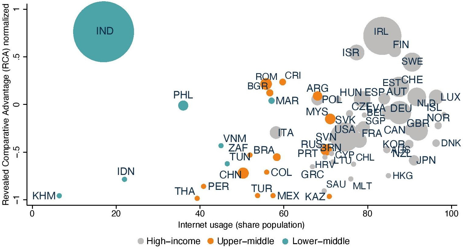 We start by analyzing countries position with respect to their internet usage (as a share of the total population), which in Figure 12 is plotted on the horizontal axis. In the figure, each dot marks a country’s position with the bubble size indicating the level of exports for the IT and information services sector. The reason for choosing this sector is because it forms the most straightforward example of digital services and the sector’s activities are at the basis of our selection of digital sectors as outlined in Table 2. Further, on the vertical axis the RCA indicator is plotted for the IT sector. The RCA variable is normalized following Laursen (2015) to facilitate visualization. Then, the colors of each bubble specify the income group to which a country belongs. Note that for the figure we take the year 2015 in which no low-income is found anymore in our country sample.[1] Blue indicates high-income countries, red upper-middle income countries, and finally green lower-middle income countries.