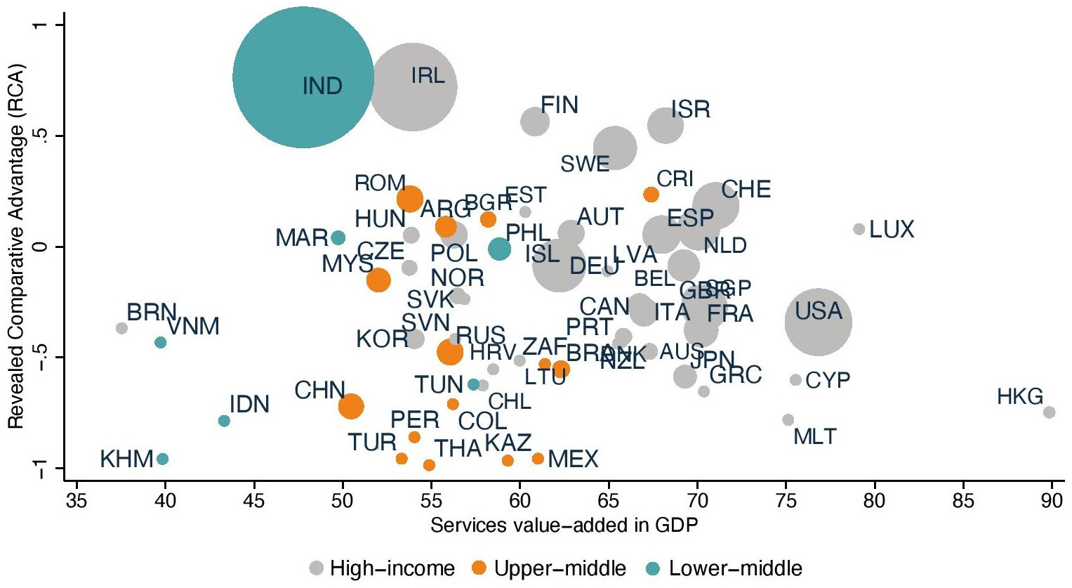 The figure suggests there is an upward trend between a country’s revealed comparative advantage in IT and information services and internet usage with India as a major exception. High-income countries are almost all placed at the right of the graph, whereas the middle-income countries at the left. More interesting however is to zoom into the relative position of countries while remembering the significant result found in Table 8 (income groups), Table 9 (RCA) and Table 10 (internet usage). Upper-middle income countries, countries with strong and weak RCAs and with a medium to high internet usage showed a positive significant result. Countries that broadly fall into this overlapping categorization would be for instance Costa Rica, Romania and Bulgaria being upper-middle income countries, and Israel, Ireland and Spain that belong to the high-income group of countries. These countries have developed a relatively high comparative advantage with medium to strong internet usage.