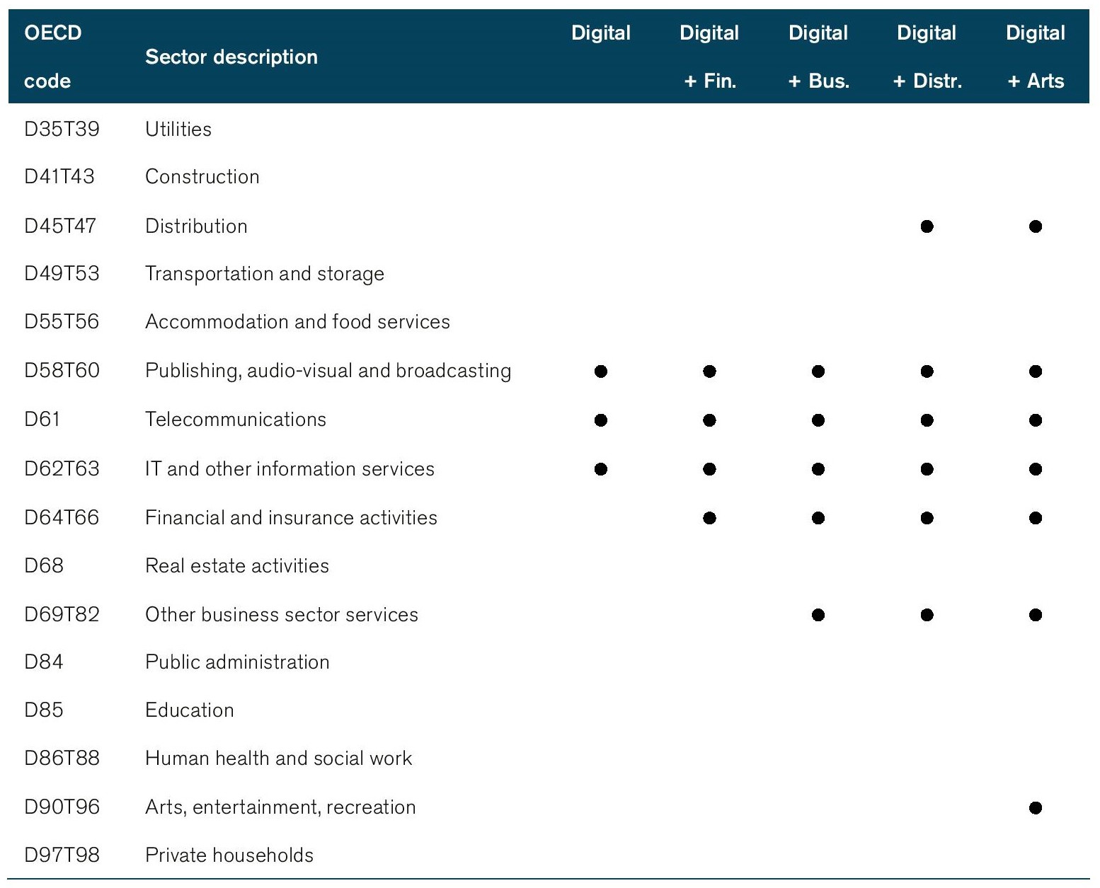 Table 1 and Table 2 show the selection of sectors that are classified as software intense following the WTO-UNCTAD-ITC and TiVA classifications respectively. In Table 1, Telecommunications, computer services and information services are natural outcomes given that these sectors are highly digital. Information services cover activities such as data processing services and web search, which are all highly intensive in the usage of software. Both financial and insurance services are also assessed as great users of software compared to labour. The two sectors are more broadly considered as very digital intense given that over the years internet technologies have massively changed the financial services industry.[2] This selection of sectors is extended with additional services that are commonly understood as digital-intense but are not strictly measured above the median, although they do when using other metrics such as the mean instead. They are shown in subsequent columns and are R&D services, Technical and other business services as well as audio-visual services.
