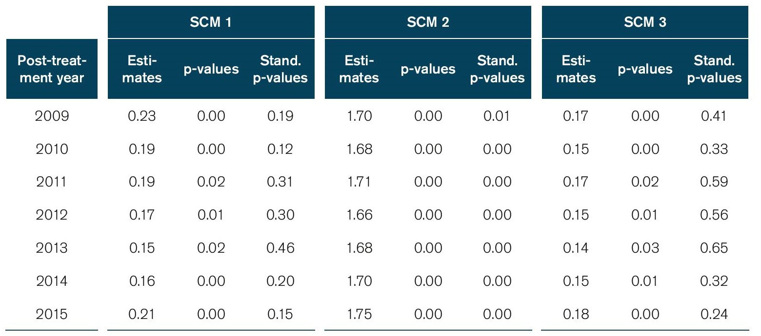 Note: Estimates correspond to the treatment effects plotted in Figure 5 for each panel (SCM1, SCM 2, and SCM 3)., after the year 2008. P-values represents statistical significance which is determined by placebo tests. Standardized p-values are the studentized p-values.