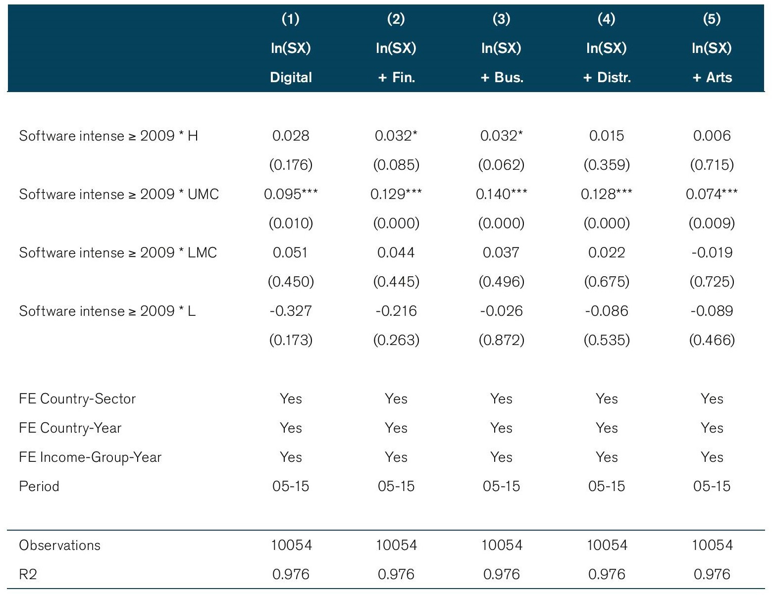 More interesting, however, is that we also investigate for which type of countries this growing gap between digital and non-digital services became most pronounced. The results show that the growth of software-intense services compared to other sectors was strongest post-GFC for upper-middle income countries. That seems contradictory to the notion that digital trade successes are typically found in advanced countries. The latter countries also show significant positive results, but these changing trade patterns are strongest for the upper-middle income countries. One potential explanation is that digital trade is sensitive to spill-over effects and digital entrepreneurship attracts many young people. Upper-middle income countries have an employment population that is relatively young whilst showing a higher urbanisation rate where external scale economies usually are high.