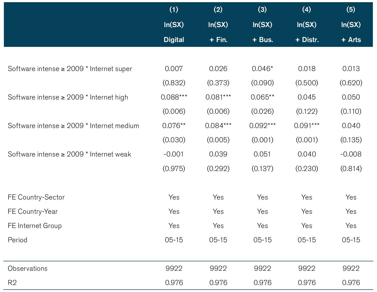 Note: * p<0.10; ** p<0.05; *** p<0.01. P-values are given in parenthesis. The dependent variable the log of services exports ln(SX) using data from the OECD TiVA database. Fixed effects are applied at the country-sector, country-year and internet-group level. Period of regressions is 2005-2015. Regressions are estimated with robust standard error clustered by country-sector-year. Column titles correspond to the sector specification as presented in Table 2.