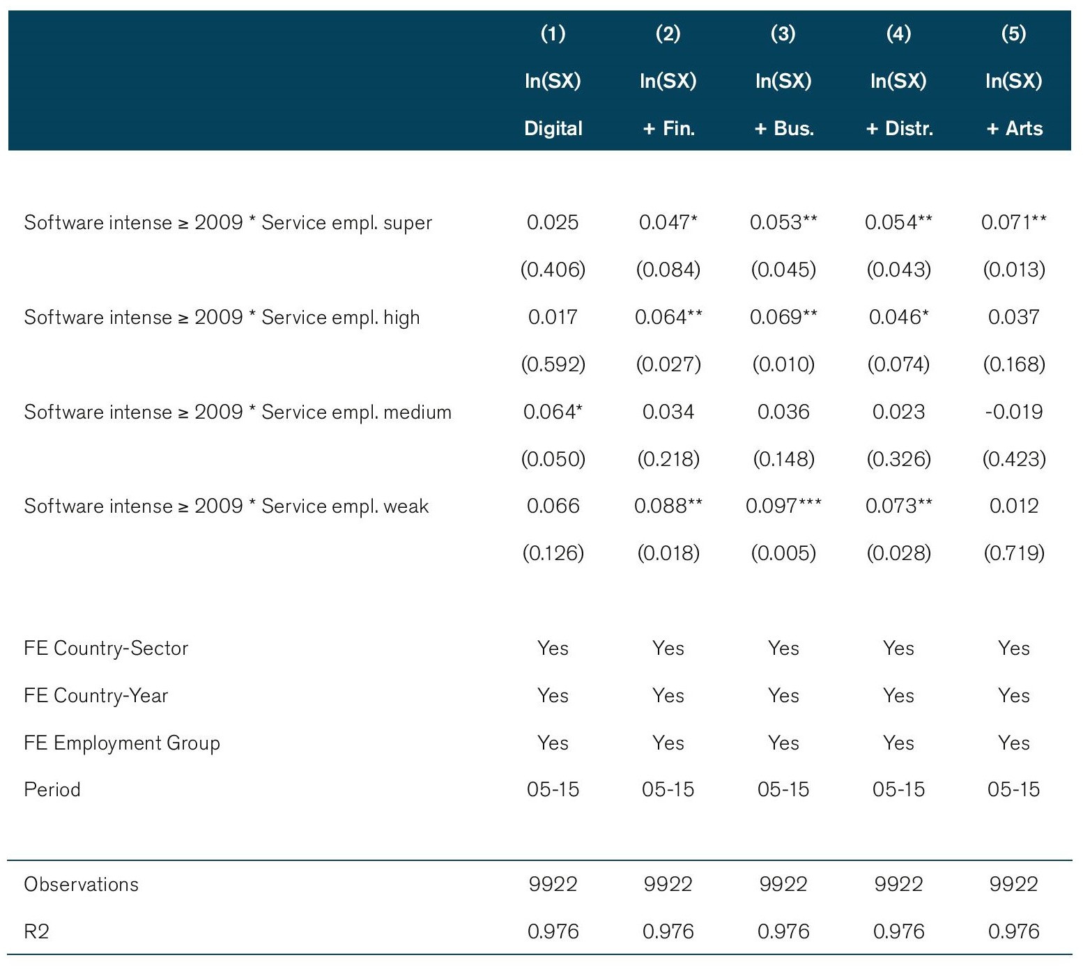 Note: * p<0.10; ** p<0.05; *** p<0.01. P-values are given in parenthesis. The dependent variable the log of services exports ln(SX) using data from the OECD TiVA database. Fixed effects are applied at the country-sector, country-year and employment-group level. Period of regressions is 2005-2015. Regressions are estimated with robust standard error clustered by country-sector-year. Column titles correspond to the sector specification as presented in Table 2.