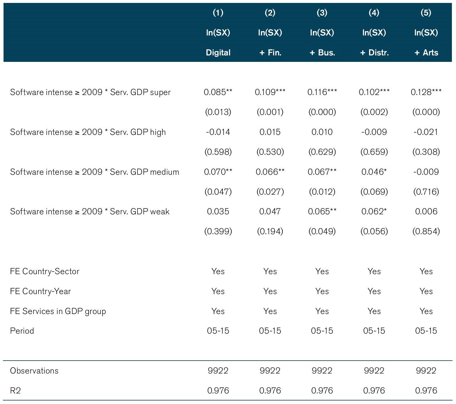 Note: * p<0.10; ** p<0.05; *** p<0.01. P-values are given in parenthesis. The dependent variable the log of services exports ln(SX) using data from the OECD TiVA database. Fixed effects are applied at the country-sector, country-year and services-in-GDP-group level. Period of regressions is 2005-2015. Regressions are estimated with robust standard error clustered by country-sector-year. Column titles correspond to the sector specification as presented in Table 2.