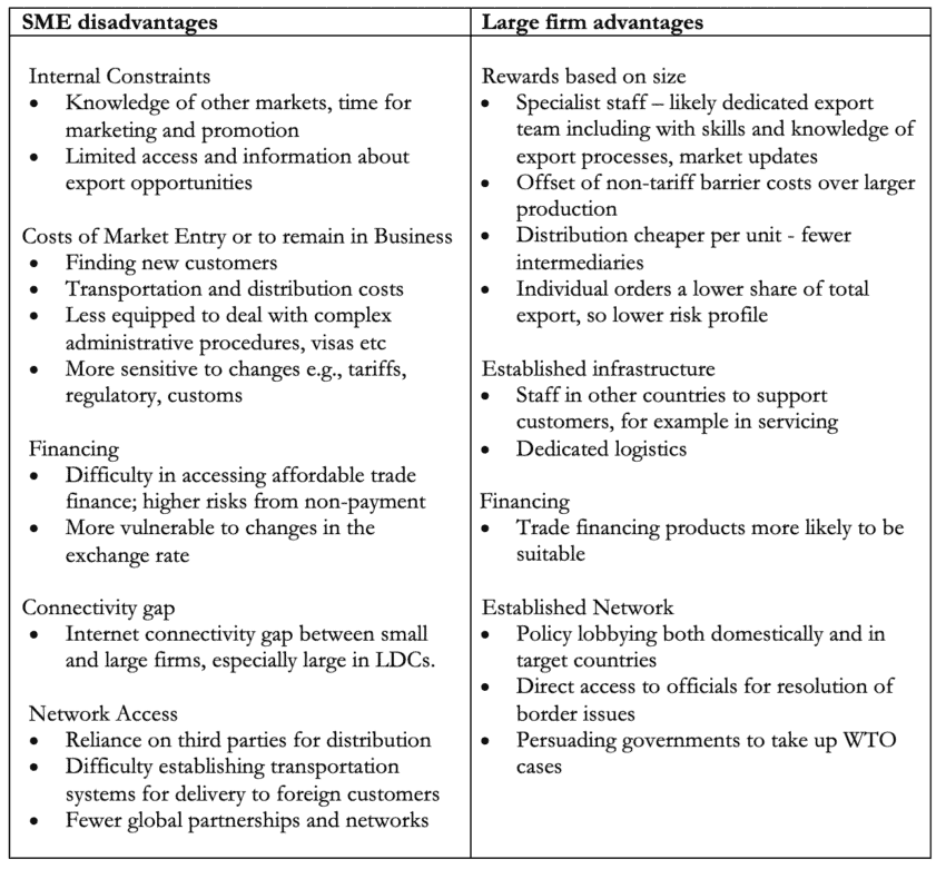 Efforts by governments to raise SME exports have not been equal to the diverse challenges, not least given more efforts are made for the largest companies. While half of all Free Trade Agreements notified to the WTO incorporate at least one provision explicitly mentioning SMEs, all of them will reflect the priorities of larger companies who are often seen as national champions.