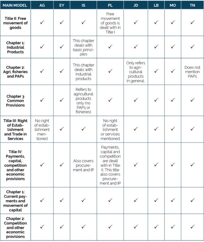 Taking this model as a starting point, the specific parts in the architecture of each agreement are the following: