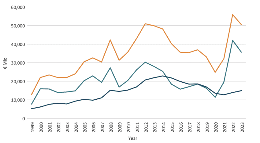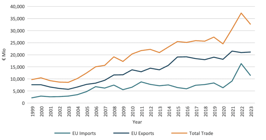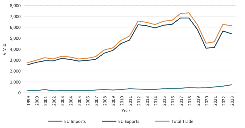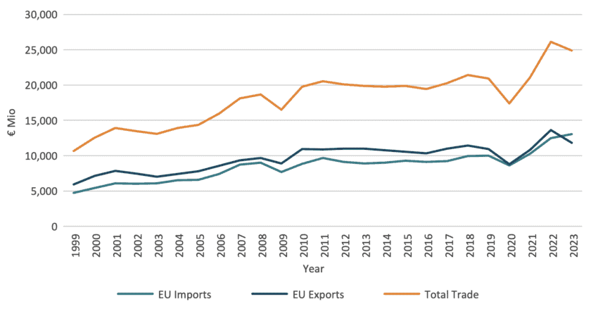 Trade flows for both the EU and Egypt started going on a positive trend since the AA came into force in 2004. The trade flows are more advantageous for the EU. However Egyptian exports went on a positive trend too. EU imports peaked in 2022 and started coming back down in 2023. Since the AA came into force trade flows never went below the pre-2004 period.