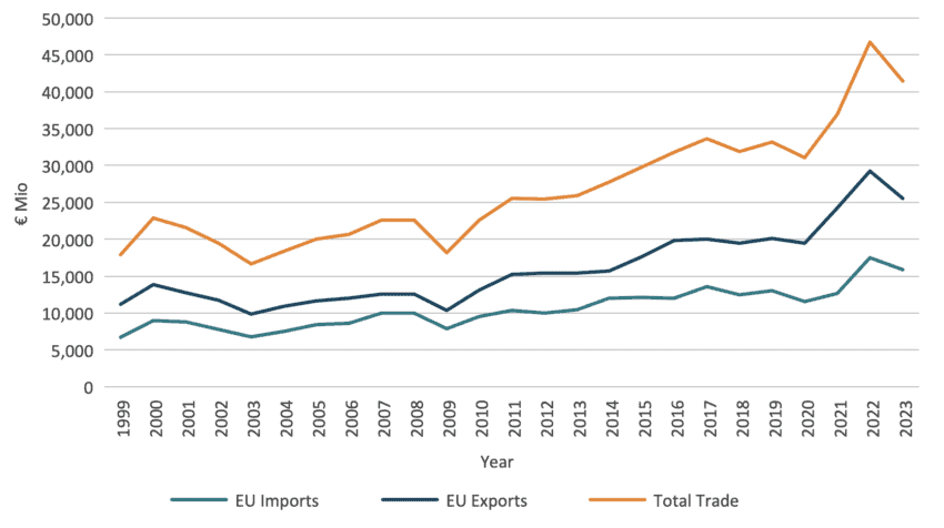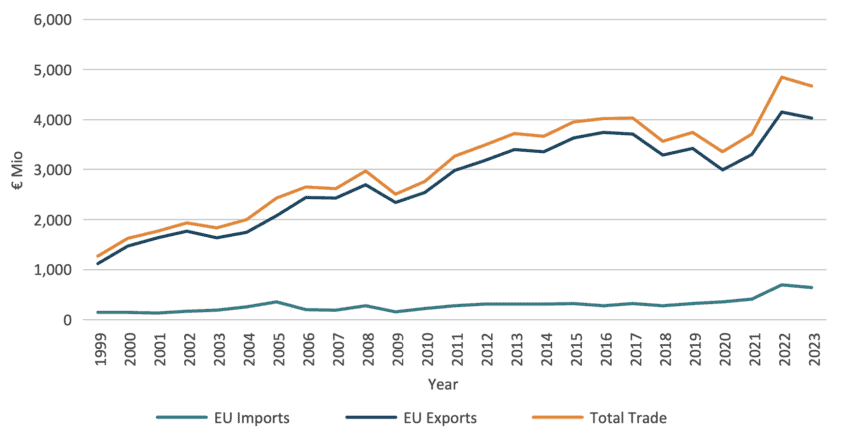 Ever since the AA came into force in 2000 both exports and imports between the two sides saw a steady gradual increase, with considerable growth taking place as from 2021