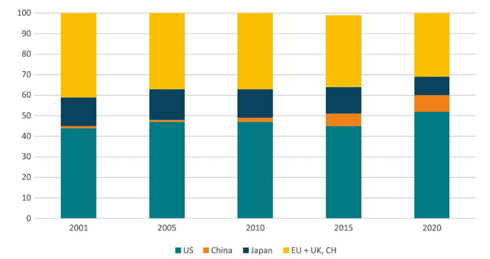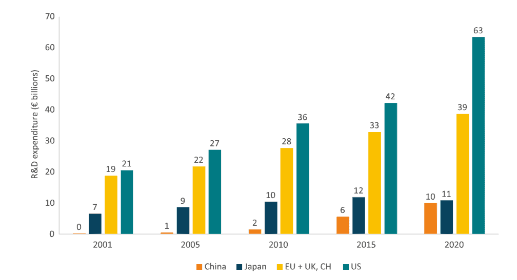 Figure 3 presents R&D expenditure collected by the major pharmaceutical industry associations. The graph shows the US leading in aggregate terms and showing a strong growth rate. China, although with much lower absolute numbers, shows a continuous increase in R&D spending. Europe’s R&D spending – which includes the EU, the UK and Switzerland – has been growing over time but at a slower rate, resulting in a widening gap with the US and a diminishing share of total global pharmaceutical R&D expenditure.