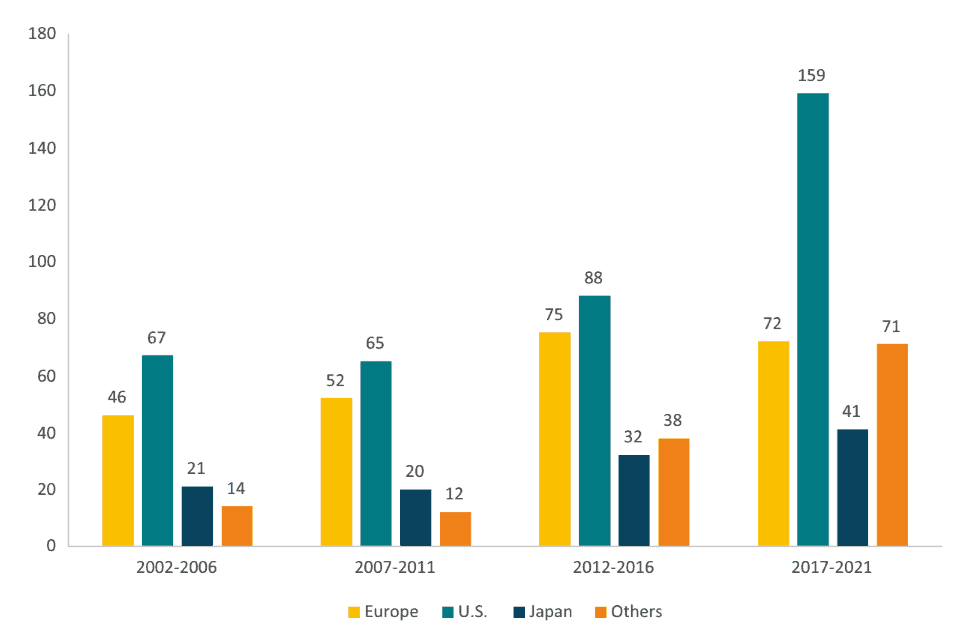 Companies at the early stage of the process play a crucial role in innovation. The headquarters of emerging pharmaceutical companies is important because the new pharmaceutical companies of today will be the future main players of tomorrow. Moderna and BioNTech – two pharmaceutical companies that played a major role in the invention of COVID-19 vaccines – were founded in 2008 and 2010 respectively. Unfortunately, the share of European-headquartered emerging biopharma companies has been declining over the last ten years, with the US dominating in terms of the number of companies and their contribution to the global pipeline of new drugs, and China growing rapidly at a rate of 456 percent between 2016 and 2021.[25]