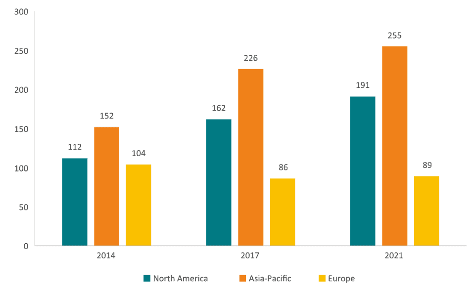 Another example of Europe’s relative decline in innovation can be found in the development of Advanced Therapy Medicinal Products (ATMP). The Asia-Pacific region (used as a proxy for China due to data limitations) has been the most competitive region in attracting ATMP clinical trials for the last seven years, and the number of trials conducted in Europe has fallen despite overall growth of the global clinical development pipeline.[27] This pattern sits at odds with the fact that, between 2017 and 2019, the lead authors of around 120,000 papers published about ATMP were affiliated with a European institution, while in the US and China, equivalent figures were 72,000 and 100,000 respectively.[28] Europe seems to be involved in the academic research, but the R&D investments go elsewhere. Again, the performance of the US shows that the forces of relative economic decline do not have to lead to falling competitiveness in a prioritised sector. The US has in fact grown the number of ATMP clinical trials – just as it has grown its market share of the Phase I drug pipeline.