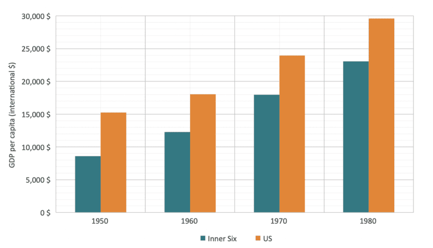 Source: Authors’ calculation based on The Maddison Project[3]. Note: The Inner Six countries include Belgium, France, Germany, Italy, Luxembourg and the Netherlands.