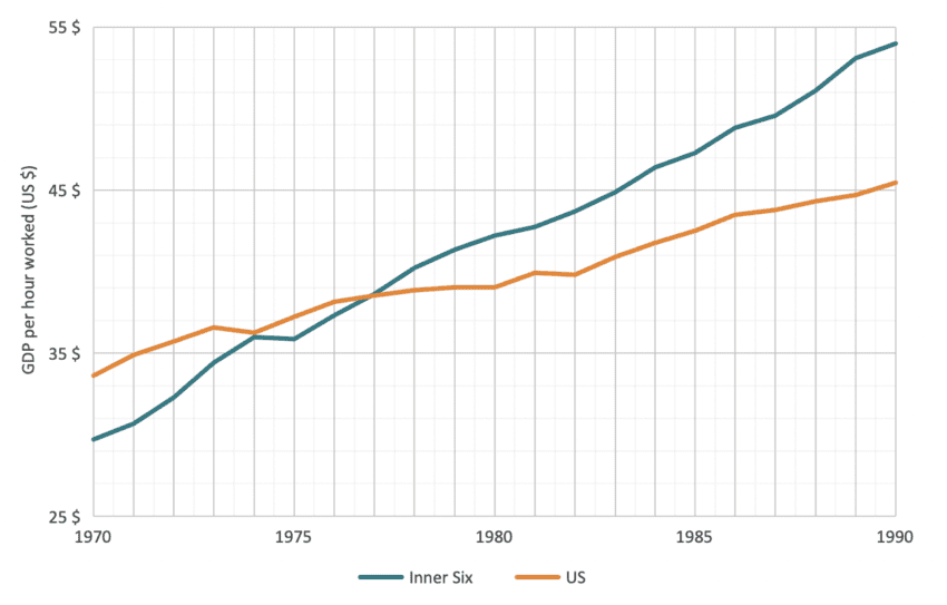 Figure 2: Inner Six and US GDP per hour worked, 1970–1990 (2015 US dollars, constant prices, PPP)