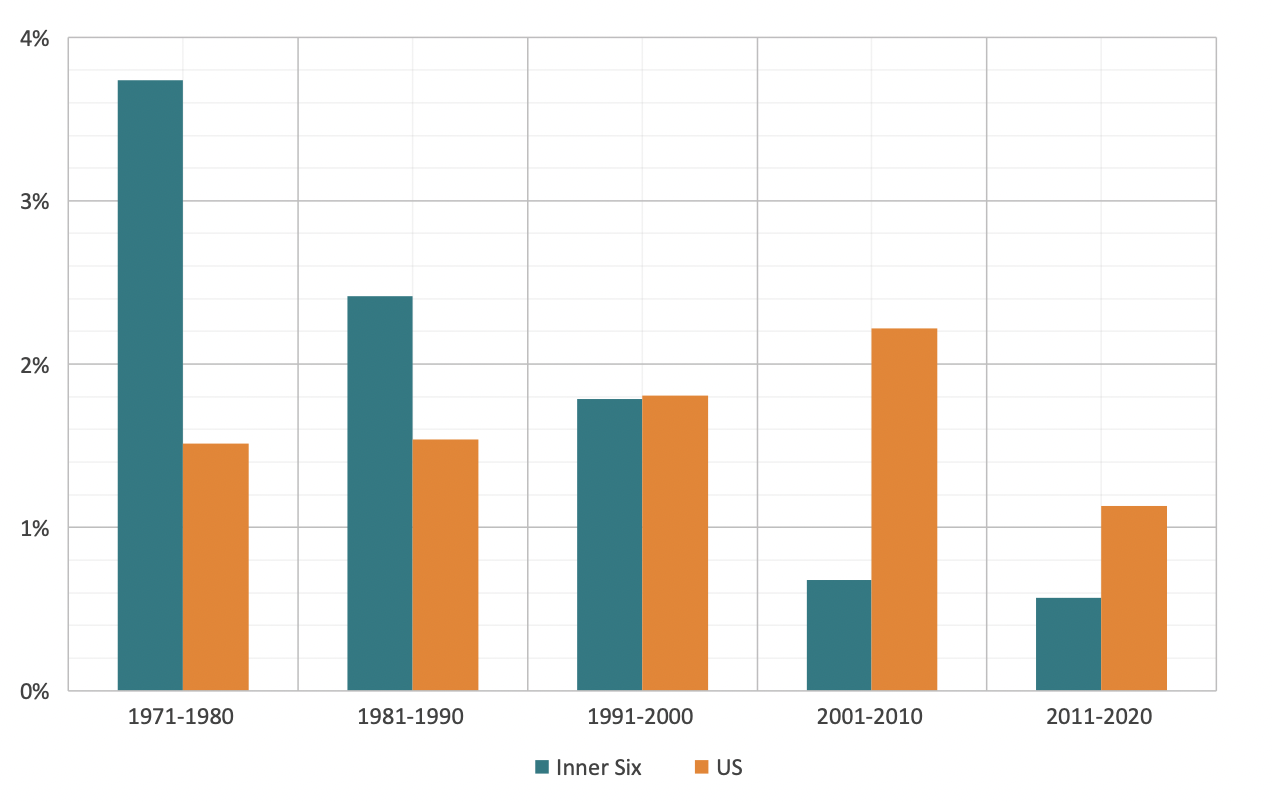 Figure 3: Average annual growth of Inner Six and US GDP per hour worked by decade, 1971–2020 (percentage, constant prices)