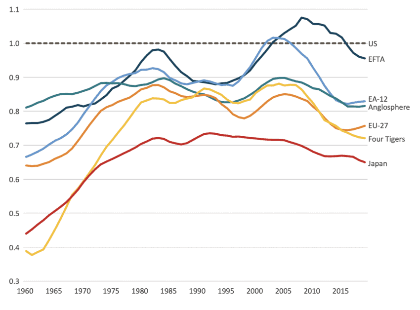 Source: Authors’ calculation based on Penn World Table[7]. Note: EFTA countries are Iceland, Norway and Switzerland (data for Liechtenstein is not available). EA-12 countries include Austria, Belgium, Finland, France, Germany, Greece, Ireland, Italy, Luxembourg, Netherlands, Portugal, and Spain. The Anglosphere includes Australia, Canada, New Zealand and the UK (excluding the US). The Four Tigers include Hong Kong, Singapore, South Korea and Taiwan.
