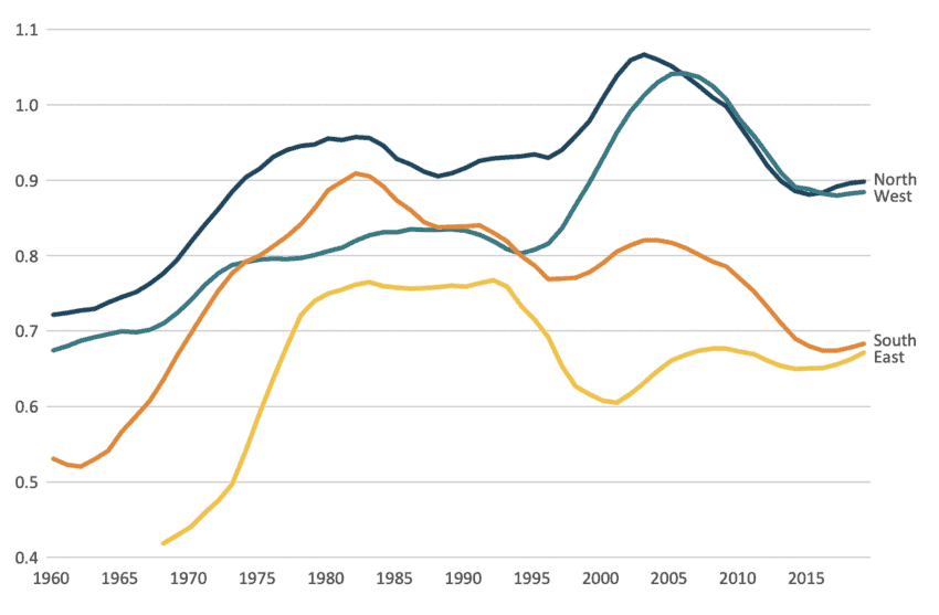 Figure 5: Total Factor Productivity (TFP) for sub-regions of the EU, 1960–2019 (current PPPs, US = 1, 5-year moving average)