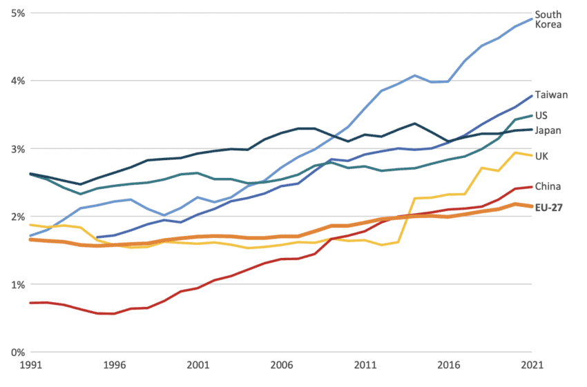 Figure 6 shows R&D spending as a percentage of GDP over time for a number of selected countries and the EU as a whole. The overall picture is alarming: out of all the economies included in the sample, the EU is the worst performer. Despite starting from roughly similar departure points in the early 1990s, countries like South Korea and Taiwan now boast R&D expenditure levels that are twice as high as the EU’s, when measured as share of GDP. China, which spent less than half of the EU’s R&D spending in relative terms in 1991, has stably widened the gap with Europe ever since the mid-2010s. The US, whose gap with the EU when measured as share of GDP already stood at over 50% in 1991, has not only maintained but substantially increased its lead to achieve an almost 70% difference in 2021.