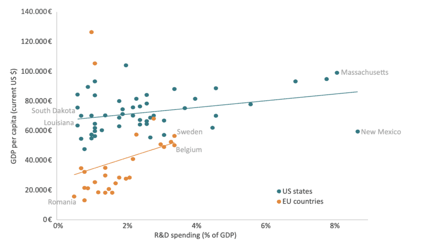 Following Figure 7, there is a strictly linear correlation between the percentage of GDP allocated to R&D spending and GDP per capita, both among EU countries and US states. Broadly speaking, the more an EU country or a US state invests in R&D expenditures, the richer it tends to be and vice versa.