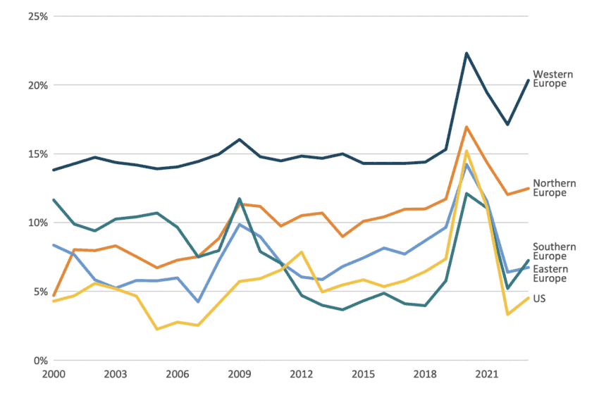 Figure 8: Saving rate for the US and sub-regions of the EU, 2000–2023 (percentage)