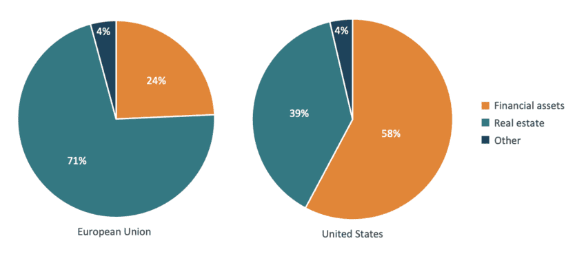 When breaking down the composition of household wealth in the EU and the US, the difference between the two regions is staggering. Figure 9 reveals that American households on average hold almost 60% of their wealth in financial assets and less than 40% in real estate. Diametrically opposed, for European households real estate is by far the main asset category with over 70% of the overall average wealth, while financial assets constitute less than a fourth of the wealth held by EU households.