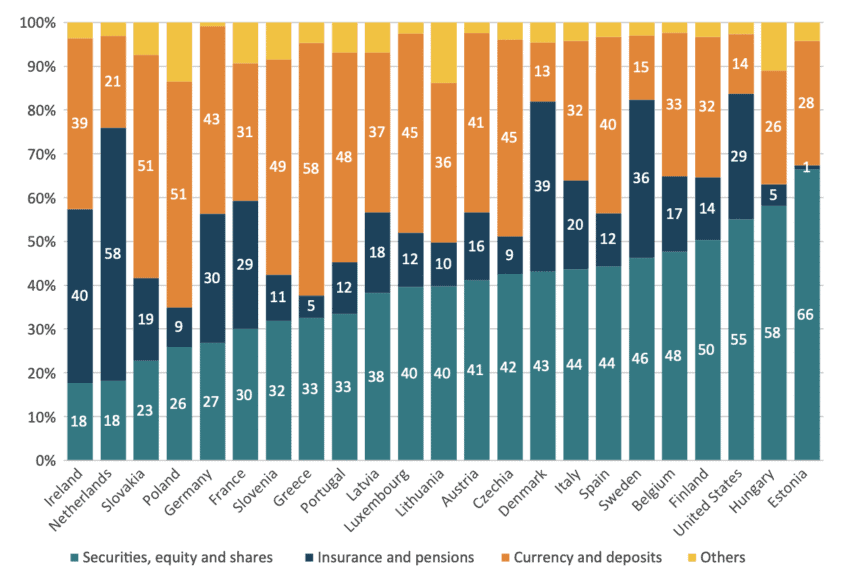 Figure 10: Household financial asset portfolio composition for the US and EU countries, 2022 (percentage of total)
