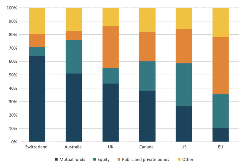 Allocation patterns tell us more about Europe’s problem of channelling savings to investments. Figure 12 reveals an unsurprising reality: similar to what happens for European savings at large, the composition of pension funds’ assets in the EU is much more cautious than anywhere else. While the portions of pension funds’ assets allocated to mutual investment funds and equity make up between 55% and 75% of the total in all the other countries in the sample, the combination of the two barely reaches 35% in the EU. The lion’s share in Europe goes to treasuries and low-risk corporate bonds, yet again the investments that regulations consider to be the safest.