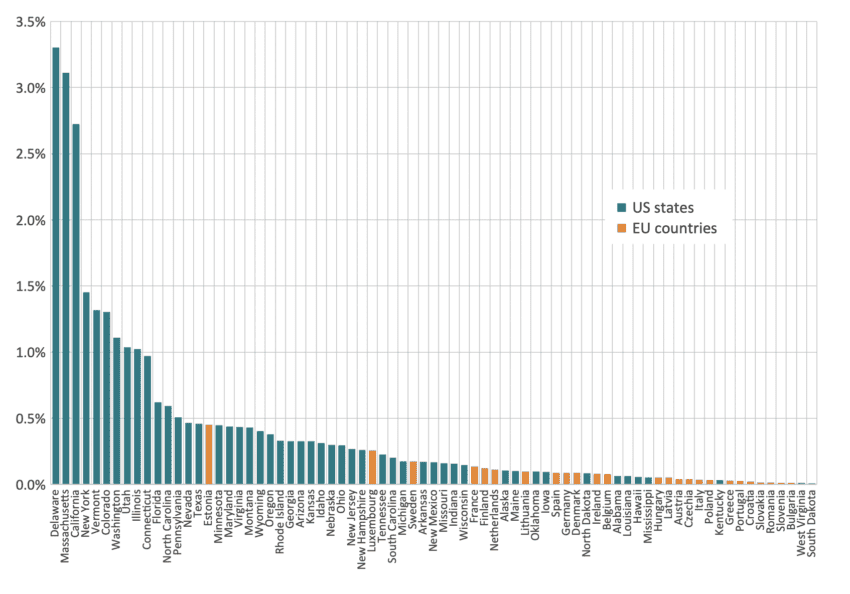Figure 13: Venture capital investment across EU countries and US states, 2022 (percentage of GDP)