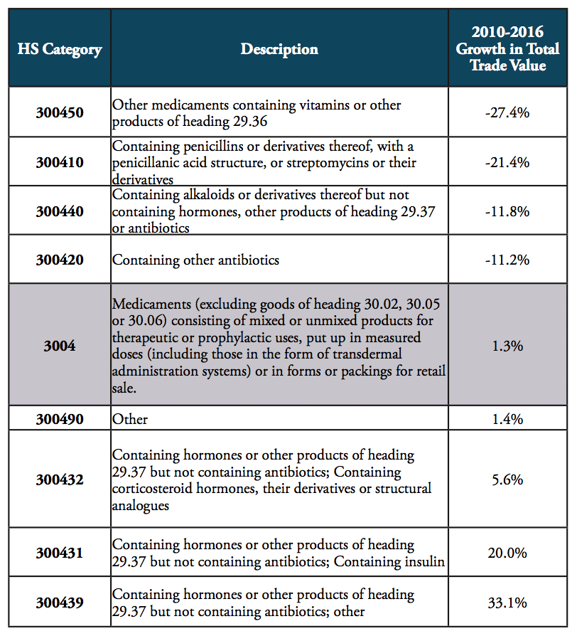 Table 1: Major medicines’ product categories and development of trade value, 2010 to 2016