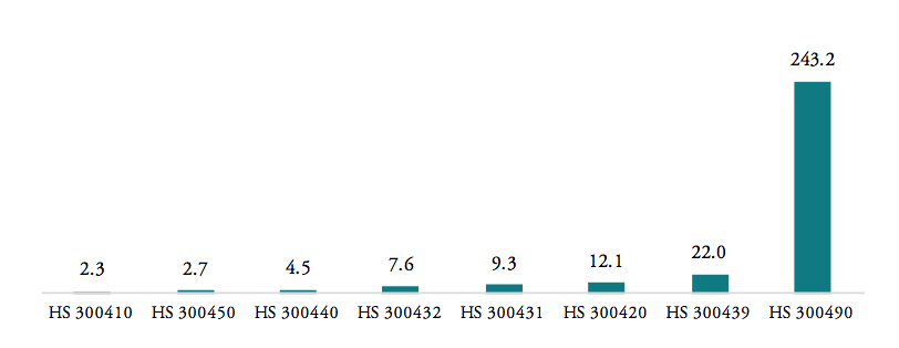 Figure 1: Total trade value of major pharmaceuticals product categories, 2016, in bn USD