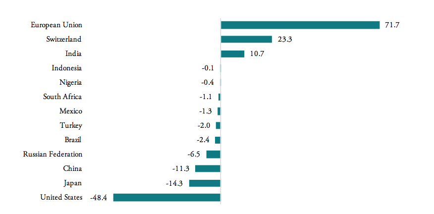 Figure 3: Trade balances in medicine products, HS 3004, 2016, in bn USD