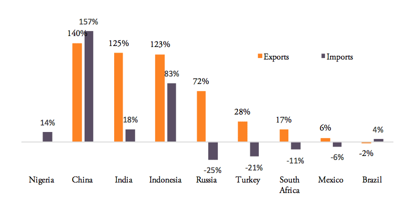 Source: WTO COMTRADE and Eurostat. For the EU, number are given in EUR. Note: Nigeria’s export growth rate for the period 2007 to 2014 (latest data available) was 1,499 per cent, an outlier, which has been eliminated from above chart.