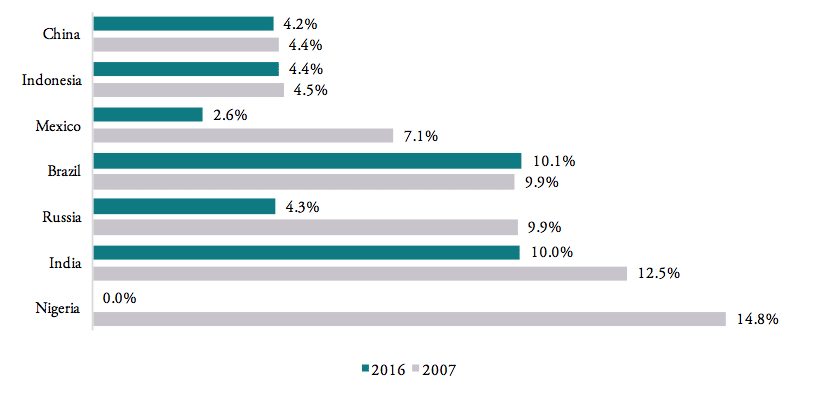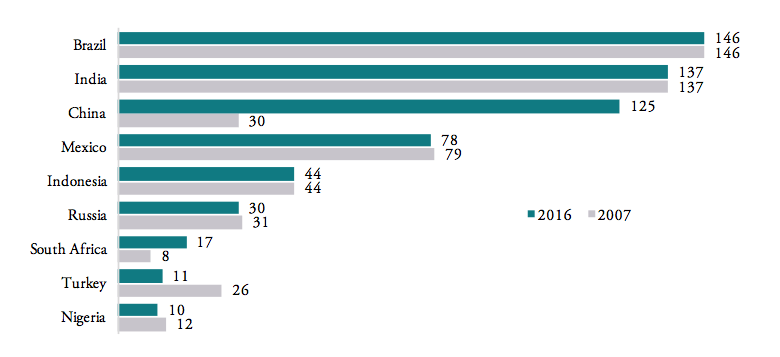 Similarly, the number of actively applied tariff lines[2] is still high for most BRICS-MINT countries, causing importers to struggle with administrative procedures and government discretion over product classification decisions. Figure 6 shows that, except for Nigeria (10 tariff lines), Turkey (11 tariff lines) and South Africa (17 tariff lines), all other BRICS-MINT countries apply more than 30 tariff lines for pharmaceuticals products within the HS 3004 product classification category. Brazil (146), India (137), China (125) and Mexico (78) apply the highest number of tariff lines. While the number of tariff lines applied by Brazil, India and Mexico did not change since 2007, the number of tariff lines applied by China significantly increased dramatically from 30 in 2007 to 125 in 2016, indicating a serious shift towards protectionism within the Chinese government.