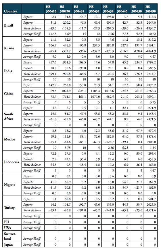 Even low import tariff rates have a significant compounding effect on the final retail price of medicines, which in turn impacts on affordability. While much of the “access to affordable medicines” debate is about intellectual property rights (IPRs) and business practices of pharmaceutical manufacturers, import duties and national protectionism are swept under the political rug. In this paper, we provide a synopsis of tariff barriers for exports of pharmaceutical products to the world’s major low and middle income countries (BRICS-MINT countries).