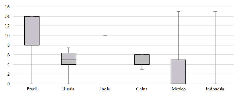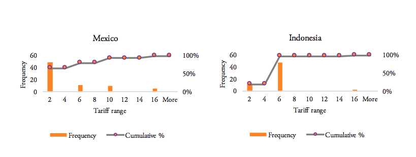 Our analysis of the distribution of import tariff levels across product-specific tariff lines reveals that half of Brazil’s tariff lines set import tariffs at levels of at least 8 per cent. Similarly, 50 per cent of pharmaceutical products’ tariff lines of Russia’s tariff schedule show import duties larger than 5 per cent. India, on the other hand, imposes a lump sum tariff of 10 per cent on every medicine product that is imported from abroad. 50 per cent of Mexico’s tariff lines show zero tariffs, while 25 per cent of Mexico’s tariff lines are set levels between zero and 5 per cent and another 25 per cent of Mexico’s import tariff lines show tariff levels between 5 and 15 per cent. Finally, 75 per cent of tariff lines in Indonesia’s tariff schedule are set at levels of at least 5 per cent (see Figure 8).