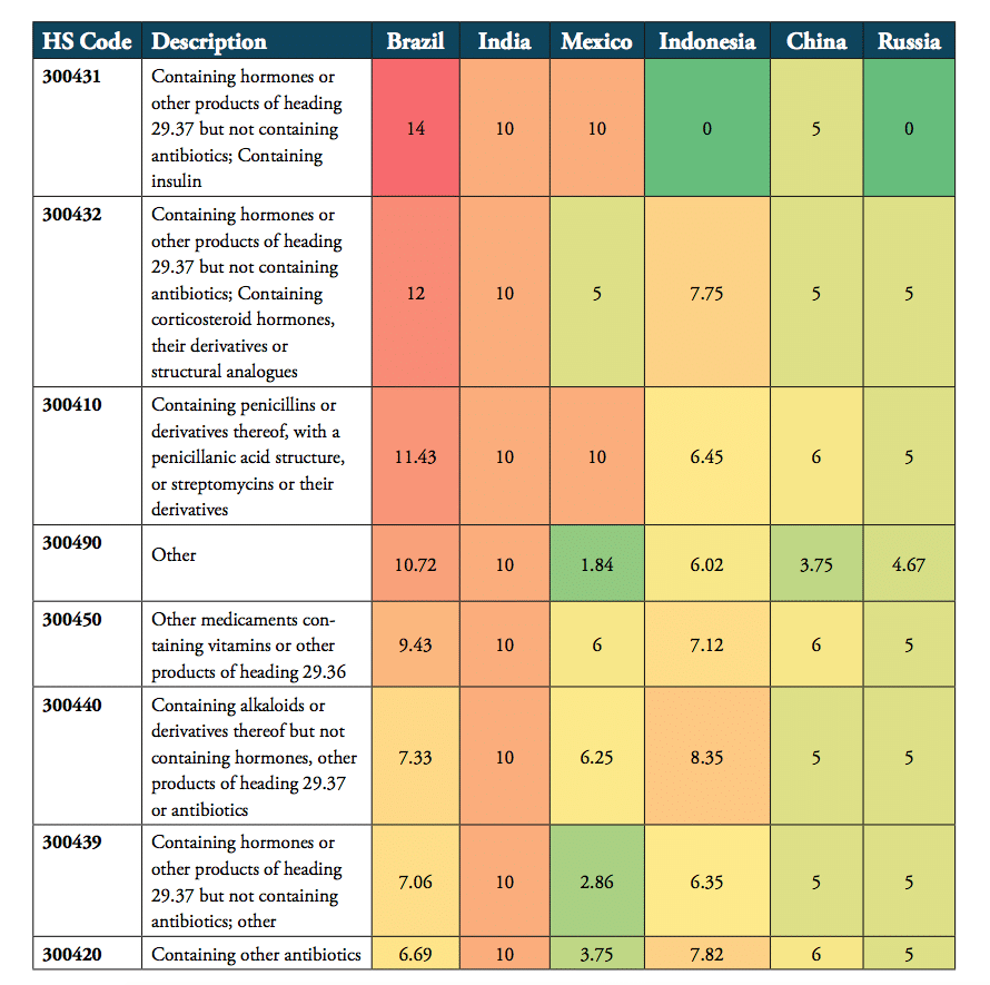 Table 3: Heat map of average tariffs for HS 3004 product categories, 2016, in per cent