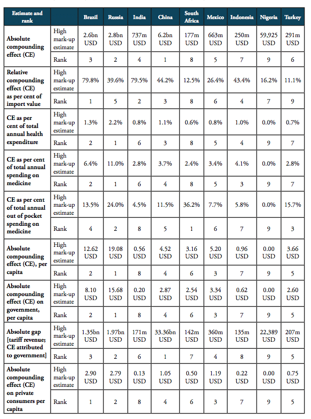 For all BRICS-MINT countries, a summary of country-specific estimates and the final country ranking is provided by Table 5. We provide estimates for (1) the compounding effect in per cent of the net import value of pharmaceutical products (see Figures 10 and 11 and Table 7 in Appendix I), (2) the absolute aggregate compounding effect based on 2016 import values (see Figure 12), (3) absolute price effects for a range of import prices ranging from 0.50 USD to 100.00 USD (see Appendix I, Figures 24 and 25), and estimates for the financial burden (potential savings) expressed (4) in per cent of total annual health expenditure (see Appendix I, Figure 26), (5) in per cent of total annual spending on medicines (see Appendix I, Figure 27) and (6) in per cent of total annual out of pocket spending on medicine (see Appendix I, Figure 28). Finally, estimates for the compounded financial burden are provided (7) on a per capita basis (see Appendix I, Table 8) and attributed to (8) the government (see Appendix I Table 9) and (9) individual private consumers and private households (see Appendix I, Tables 10 and 11). Country snapshots are provided in Appendix II.