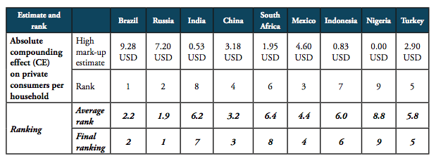 Table 5: Summary of country-specific estimates and final ranking, high mark-ups scenario