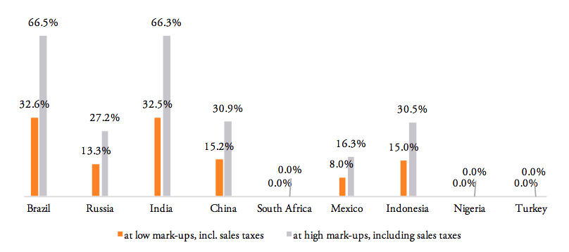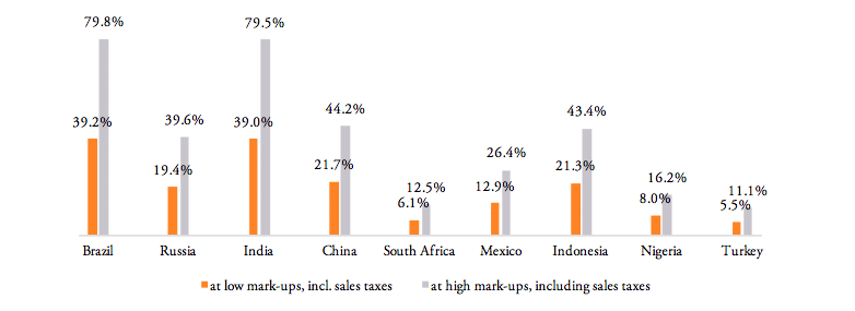 At a first glance, tariffs on pharmaceutical products in BRICS-MINT countries may look as if they make up a small proportion of the total cost of medicines only, adding a negligible amount of money to the price of medicines paid exclusively by importers. Yet, because of multiple percentage mark-ups that are added to the base import price of medicines (i.e. the ex factory price of a drug), even low tariffs add significantly to the final price of a medicine product when several mark-ups are charged by distributors along the distribution chain (see, e.g., Goel 2015; Olcay and Laing 2005[1]).