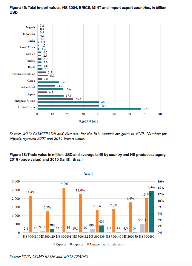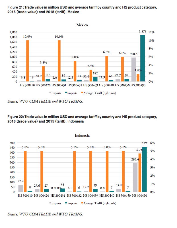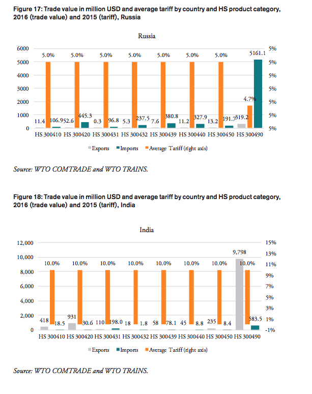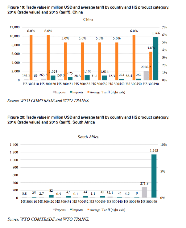 As applied tariffs also vary substantially within HS 3004 product lines, foreign importers willing to export to these countries have to employ specialized, and therefore expensive resources to administer databases, certificates, customs and payment procedures and liaise with government authorities to be eligible to serve customers in these markets. All of these costs are passed on to importers in these countries, which, in addition to the nominal import tariff and domestic sales taxes, are passed on to distributors, pharmacies, hospitals, doctors and, finally, patients. The alignment and simplification of heterogeneous customs procedures and import requirements is the key rationale of the WTO’s Trade Facilitation Agreement (TFA), which was concluded in 2013 and entered into force on 22 February 2017. The full implementation TFA, if effectively implemented, is estimated to reduce trade costs by an average 14.3 per cent for African countries, while least developed countries (LDCs) could enjoy an even bigger reduction in trade costs (WTO 2017).