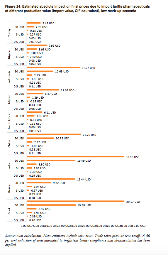 In 2016, the weighted average tariff for pharmaceuticals imported to Brazil was 10.1 per cent, while imported pharmaceutical products were worth 3.3bn USD. While tariff revenues collected by the Brazilian government amount to 330mn USD, the total financial burden imposed on Brazilian consumers of medicines amounts up to 2.2bn USD compared to trade at zero tariffs and 2.6bn USD when border compliance and documentation inefficiencies are taken into consideration. For Brazil, the compounding effect ranges from 33 per cent (low mark-ups, zero-tariff trade) to 80 per cent (high mark-ups, zero-tariff trade, reduction in trade facilitation inefficiencies) of the import value of a pharmaceutical product. In other words, Brazilian consumers currently have to pay a premium of up to 80 per cent of the import value of a medicine product due to the imposition of an import tariff at the border.