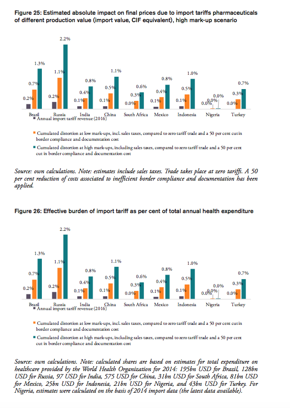 Studying the impact on final prices for consumers, we estimate that the annual compounded financial burden of import tariffs on pharmaceuticals and prevailing trade facilitation inefficiencies is highest for China (up to 6.2bn USD), Russia (up to 2.8bn USD), Brazil (up to 2.6bn USD) and India (737mn USD), followed by Mexico (663mn USD), Turkey (290mn USD), Indonesia (251mn USD), South Africa (177mn USD) and Nigeria (60,000 USD). For Brazil and India, tariffs on medicines increase their final price by up to 80 per cent of the original sales price ex factory. As most BRICS-MINT governments directly buy or settle patients’ invoices for a bulk of medicine products, the sum of all tariff-induced premiums on final prices for pharmaceuticals tends to exceed by far the tariff revenues initially collected by these governments’ customs authorities.