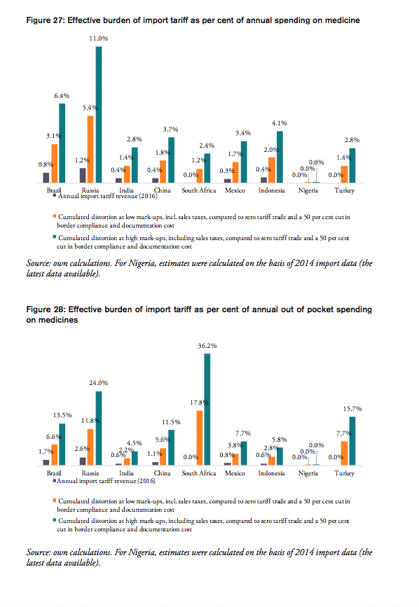 Source: own calculations. Note: numbers represent absolute and relative estimates derived from the compounding effect () on the basis of high mark-ups in comparison to a scenario that is based on zero-tariff pharmaceuticals trade and a reduction of 50 per cent of costs related to general inefficiencies in border compliance procedures and documentation requirement. For Nigeria, estimates were calculated on the basis of 2014 import data (the latest data available).