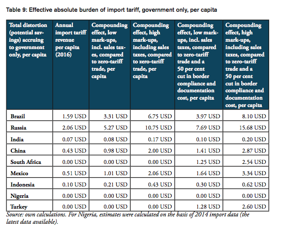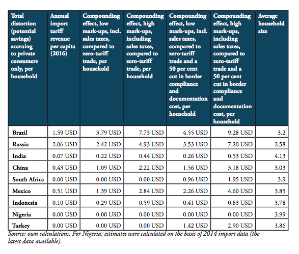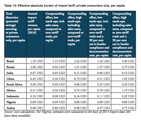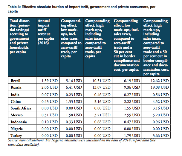 The compounding effect per capita is highest for Russia (19.08 USD), Brazil (12.62 USD), Mexico (5.20 USD) and China (4.52 USD), followed by Turkey (3.66 USD), South Africa (3.16 USD), Indonesia (0.96 USD), and India (0.56). Due to low import volumes as well as zero import tariffs, the estimated numbers are only marginal for Nigeria.