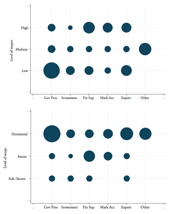 However, the spread of these types of LCRs appears to differ along their levels of impact and scope. The panels show that most LCRs on government procurement are having a low impact, although there are many in place. In contrast, most LCR measures that relate to financial support and business operations as well as market access have a high impact. In addition, the second panel illustrates that most of the government procurement LCRs apply horizontally, which is also the case for many LCRs related to exports or market access. Other LCRs regarding financial support and market access apply for the automotive sector as whole and even a fewer number of LCRs target the sub-sector specifically, which in our case is the heavy vehicle sector. LCRs related to investments are less prevalent whilst market access LCRs do not target any specific item in the heavy vehicles sector.