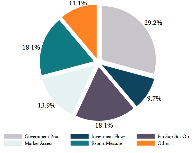 Measuring the harm caused to foreign trade and investment by the type of measure, LCRs have been ranked fifth (public procurement localization) and seventh (other localization requirements) (Evenett, Fritz, 2016, 36). The other measures that are on places one to four are state aid, trade defense, import tariffs and export taxes or restrictions, while trade finance measures are on sixth place. (Evenett & Fritz, 2016). LCR measures related to trade can take on various forms but an increase has been observed in the use of LCRs related to data localization requirements. As data flow has become an essential aspect of trade, LCR measures related to this have an impact on a majority of sectors within an economy (OECD, 2016, 3). There is an increasing effort to control the local storage and processing of data as well as the movement of personal data. LCRs are highly common in the form of discriminatory government procurement, which reduces the number of eligible firms to enter a market. This reduces output and employment while increasing market power and procurement costs (OECD, 2016, 3). Some experts already perceive this type of protectionism as “perhaps today’s greatest threat to the further liberalization of the global trading system” (Ezell et al., 2013, 5).