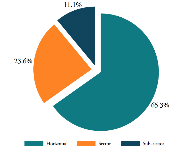 The division of the third dimension of scope is outlined in Figure 2.6. It shows that most of the measures have an economy-wide reach in the sense that they affect all sectors in a BRICS country. There are about 47 of these measures in place. In addition, 17 LCRs target specifically the automotive sector at large which covers various sub-sectors such as overall motor vehicles and parts and components of this sector as well as the heavy vehicles sectors. Last, there is only a smaller amount of LCRs that target a sub-sector specifically, which in our case is the heavy vehicles sector.
